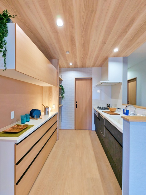 まずはキッチン。今回のキッチンのポイントは2つ!まずは「動線の良さ」。買い物から帰ってきた際の動線を考え、キッチン場所をLDKの入口付近としました。さらにダイニングスペースがキッチン横にあるので、配膳や食器の片付けもとても楽。さらにさらに、何といっても隣の「洗面脱衣所兼ランドリースペース」への扉もあるので、家事動線が一直線に繋がる、とても快適な間取り!「リビング⇔キッチン⇔洗面脱衣室」の行き止まりの無い回遊動線は、この家の一押しポイントです。