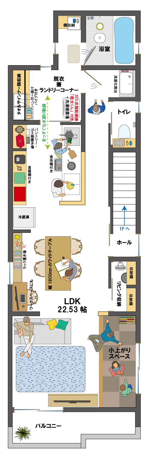 大人はPCや趣味をしたりと「自分の時間が流れるスペース」を作ることができます。キッチンも広いことで片付けやすくなったり、料理もしやすくなることで、気持ちの面でも家事負担が減ると思います。小さなお子様がいれば、小上がりも使ってプラレールを広げたり、おままごとをしたりと、思う存分おもちゃで遊べたり、小学校になれば机を置いてリビング学習をすることもできます。長時間暮らすLDK空間だからこそ、暮らしの幅が増える「広いLDK」が良いのではないでしょうか?